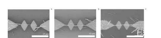 單島微電極進(jìn)行了納米線介電組裝實(shí)驗(yàn)之后,在寬度相同的雙島微電極中再次進(jìn)行納米線的介電組裝實(shí)驗(yàn),實(shí)驗(yàn)結(jié)果見圖3.圖3a顯示,電場頻率為150 kHz時(shí),左側(cè)的微間隙以及2個(gè)導(dǎo)電島間的微間隙沉積了少量納米線,且兩側(cè)電極上同樣沉積了少量納米線;圖3b顯示,電場頻率為500 kHz時(shí),電極系統(tǒng)中納米線組裝數(shù)量顯著提升,且微間隙被多根納米線搭接,同時(shí)出現(xiàn)少量的互相平行的納米線;圖3c顯示,電場頻率為1 MHz時(shí),電極系統(tǒng)內(nèi)組裝的納米線少量增加,微間隙之間仍然存在納米線搭接現(xiàn)象,總體趨勢(shì)和500 kHz時(shí)相差不大。