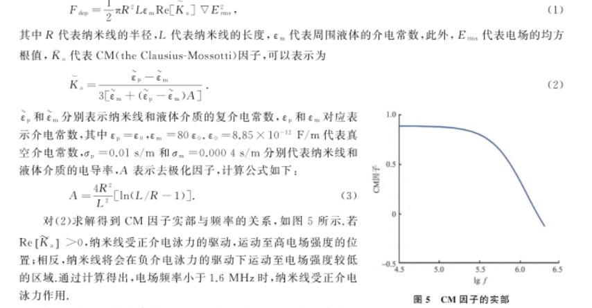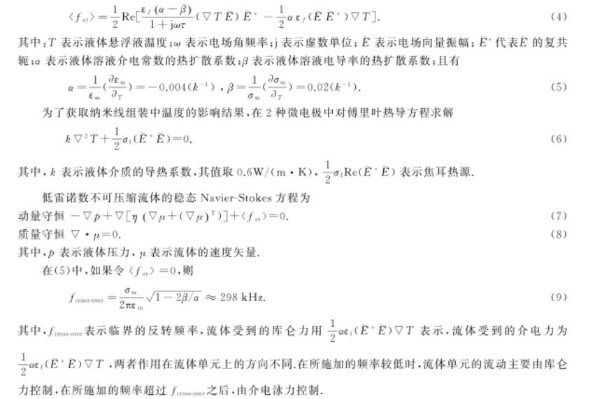 在微間隙電極系統(tǒng)介電組裝過程中,納米線在中高頻環(huán)境下的移動(dòng)是由近場介電泳力和遠(yuǎn)場電熱對(duì)流共同引起的。移動(dòng)速度為