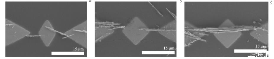 為了探究納米線的介電組裝特性,首先在寬度約為4μm的單島微電極上進(jìn)行ZnO納米線的組裝實(shí)驗(yàn),不同頻率下的實(shí)驗(yàn)結(jié)果見圖2.圖2a顯示,電場頻率為150 kHz時(shí),有少量納米線將導(dǎo)電島和電極搭接起來;圖2b顯示,電場頻率為500 kHz時(shí),搭接導(dǎo)電島和電極的納米線數(shù)量增多,且左右兩側(cè)的電極上也沉積了少量的納米線;圖2c顯示,電場頻率為1 MHz時(shí),搭接導(dǎo)電島和電極的納米線數(shù)量再次增多,并且出現(xiàn)了互相平行的納米線。