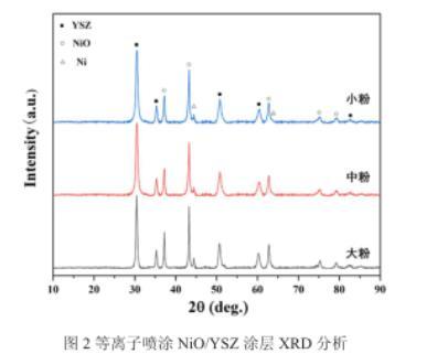 圖2為等離子噴涂NiO/YSZ氫電極的XRD圖譜,可以看出氫電極中除NiO與YSZ外,還出現了金屬Ni相,這是由于在高溫等離子體中NiO發生了還原。從圖中可看出,隨粉末粒徑的變化,還原Ni的含量變化不大。利用K值法定量分析了還原前氫電極中Ni的含量表明,在噴涂過程中,小粉、中粉、大粉制備的氫電極中NiO還原為Ni的含量分別為9.25%、10.82%、9.97%。