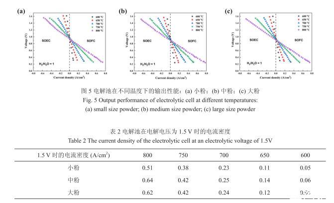 圖5為電解池Ni/YSZ|ScSZ|LSCF的氫電極以50%H2O/50%H2為反應氣體,氧電極暴露在空氣中的輸出性能測試結果。從圖中可看出,所有電解池的開路電壓與理論開路電壓值基本相同。電解池的開路電壓(OCV)在600℃到800℃范圍內隨著溫度的升高而降低。在SOEC模式下,電池的電解電壓隨著電流密度(絕對值)增加而升高;在SOFC模式下,電池的放電電壓隨著電流密度的增加而減小。在整個測試區間,隨著溫度升高,V-I曲線斜率下降,單位電流密度升高所需的電解電壓減小,電解池的性能提高。當電解電壓為1.5 V,由小粉、中粉、大粉制備的氫電極組裝的電解池在800℃時的電流密度分別為0.51 A/cm2、0.64 A/cm2、0.61 A/cm2,其他溫度下的具體數據如表2所示。因此,在一定的電解電壓下,電解電流密度隨溫度的升高而顯著升高。其中,中粉制備的電池電解電流密度最高。