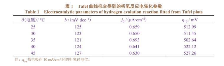圖3為不同鍍液溫度下電沉積所得的鎳電極在1 mol/L NaOH溶液中的Tafel曲線,表1為根據(jù)式(1)擬合所得的電催化參數(shù)。由表1可知,當(dāng)溫度為25~45°C時,鎳鍍層的塔菲爾斜率都接近118 mV/dec,說明其析氫過程遵循Volmer-Heyrovsky機理,反應(yīng)速率受Volmer步驟控制。當(dāng)鍍液溫度為35°C時,塔菲爾斜率最小,為121 mV/dec,析氫催化活性最好,這與析氫極化曲線分析結(jié)果一致。