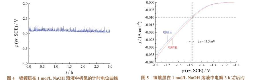 鎳鍍層在0.01 A/cm2的電流密度下連續(xù)電解3 h期間電極電位無明顯波動,穩(wěn)定性較好。連續(xù)電解3 h前、后鎳鍍層的析氫極化曲線變化不大,析氫過電位僅增大11.3 mV,說明鎳鍍層具有良好的穩(wěn)定性。