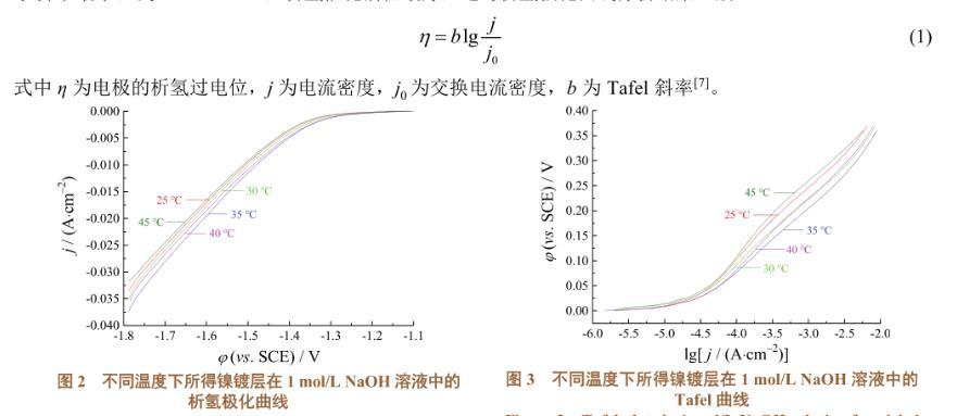 從圖2可知,隨溫度升高,鎳鍍層在1 mol/L NaOH溶液中的析氫極化曲線先正移后負(fù)移,說明在相同電流密度下鎳鍍層的析氫電位先減小后增大,即電催化析氫性能先改善后變差。比如電流密度為0.025 A/cm2時,在溫度35°C下所得鎳鍍層的析氫電位最正,約為1.66 V,電催化析氫性能最好。