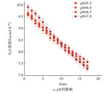 ①利用微電極研究了酸性條件(5.5~7.0)對N2O還原的影響,發(fā)現(xiàn)N2O的還原速率隨pH的下降及FNA濃度的升高呈降低趨勢,且存在FNA時降低幅度增大,表明酸性條件及FNA均可抑制NOS活性,且后者是主要抑制劑。