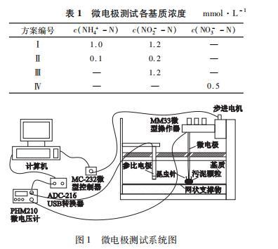 2)測試系統。試驗采用自制NH4+,NO3——,NO2——和pH等4種離子選擇性微電極,對污泥基團內部中氮素遷移轉化特征進行研究,制作方法參照國外相關制作方法。制作的微電極尖端直徑在25μm以內,響應時間≤2s,穩定性較好,符合實際檢測應用所需標準。微電極測試線路如圖1所示。表1微電極測試各基質濃度圖1微電極測試系統圖從反應器進水端取出顆粒污泥置于測量室中,先用昆蟲針沿豎直方向插入顆粒污泥兩端,使其固定在致密的網狀支撐物上,預培養3h后進行測定。利用微調控器調節,使得電極尖端處于顆粒表層以上300μm處開始測定,步長設為100μm.由于顆粒內部物質濃度呈對稱性分布特征,微電極測定時只檢測了顆粒污泥一半區域氮素的空間分布特征,以得到具有代表性的濃度分布變化。