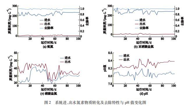 圖2系統進、出水氮素物質轉化及去除特性與pH值變化圖