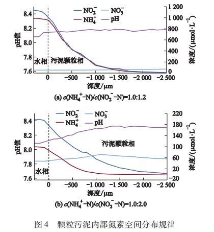 基質中各物質濃度之比分別為c(NH4+——N)/c(NO2——N)=1.0∶1.2和c(NH4+——N)/c(NO2——N)=1.0∶2.0時,顆粒污泥內部氮素遷移轉化的空間分布特征如圖4所示。