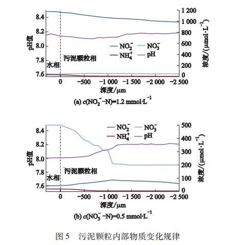 當基質中只含有亞硝酸鹽氮時(見圖5a),亞硝酸鹽的濃度持續降低,氨氮和硝酸鹽氮的變化甚微,pH值略有增加,說明反硝化菌以亞硝酸鹽氮為電子受體發生了內源反硝化反應;當基質中只含硝酸鹽氮時(見圖5b),顆粒表層區域(0——1200μm),硝酸鹽濃度減少,亞硝酸鹽濃度略微增加,說明此段因缺乏氨氮和亞硝酸鹽氮致使厭氧氨氧化菌活性受到抑制,發生了將硝酸鹽氮還原為亞硝酸鹽氮的反硝化。顆粒污泥內部1200μm到2500μm區域內,亞硝酸鹽氮濃度減小,硝酸鹽氮濃度變化甚微,說明發生了反硝化反應。
