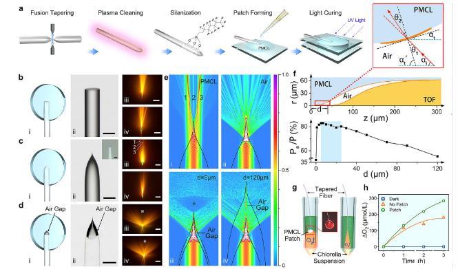 圖2、iCarP的制備和光散射性能。a TOF在PMCL貼片中的制備。產生了一個空氣間隙以獲得iCarP。b–d平面光纖光子器件(FEOF)(b)、嵌入PMCL貼片中的TOF(c)和iCarP(d)。(i)器件的示意圖,(ii)器件的顯微圖(代表性大于3個器件),比例尺=100微米,c的插圖:錐形光纖尖端,比例尺=2微米,(iii、iv)器件的正視圖(iii)和側視圖(iv)以及激發的熒光,比例尺=5毫米。*表示iCarP正向方向的暗區域。比例尺=5毫米。e光子器件發出的光的模擬電場強度分布,(i)PMCL中沒有空氣間隙的TOF,(ii)空氣中的TOF,(iii)具有d=5微米的iCarP,(iv)具有d=120微米的iCarP。f頂部:iCarP中空氣間隙和TOF尖端的軸對稱橫截面圖,底部:橫截面的百分比光功率(Ps)與總功率(P)之間的關系以及d的關系,插圖:局部光路圖,(z:TOF尖端到空氣間隙尖端的距離;αt:空氣/PMCL界面的切線平面與TOF軸向方向之間的角度;αt’:切線平面法線與TOF軸向方向之間的角度;αi:入射光的發散角;θ1:空氣側的入射角;θ2:PMCL側的折射角;P:空氣間隙的總光功率;Ps:正向傳播區域的光功率)。g iCarP照明誘導的嘧啶藻氧產生的檢測方案:iCarP(左)和TOF(右)處于“開啟”狀態,浸入嘧啶藻懸浮液(綠色),并監測氧產生。h iCarP或TOF照明誘導的嘧啶藻氧累積產生,以及在黑暗中。
