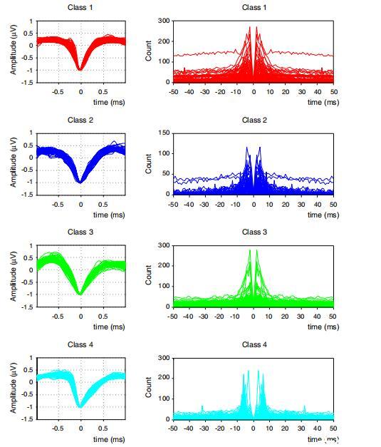 圖4、神經(jīng)元分類為假定主細(xì)胞(PCs)與中間神經(jīng)元(INTs)。左圖:基于主成分分析的四類神經(jīng)元波形圖。右圖:對(duì)應(yīng)的自相關(guān)直方圖(ACG)。