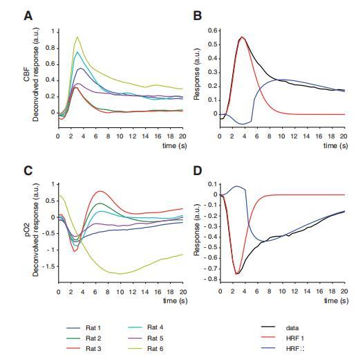 圖5、血流動(dòng)力學(xué)與代謝響應(yīng)函數(shù)(HRF)。A:通過(guò)反卷積計(jì)算獲得的各只大鼠CBF脈沖響應(yīng)函數(shù)。B:基于大鼠1的CBF響應(yīng)(黑色),擬合的gamma函數(shù)HRF1(紅色)和HRF2(藍(lán)色)。C:所有大鼠經(jīng)反卷積獲得的PO2響應(yīng)。D:大鼠1的PO2響應(yīng)擬合gamma函數(shù)。需注意大鼠間存在顯著變異(體現(xiàn)在響應(yīng)幅值及后半段形態(tài)差異:CBF表現(xiàn)為向基線的漂移,PO2則出現(xiàn)超調(diào))。ED發(fā)生時(shí)刻定義為時(shí)間0。