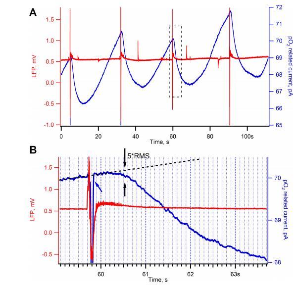 圖2、氧分壓(PO2)探頭延遲時(shí)間的評(píng)估。采用離體完整海馬組織,通過(guò)荷包牡丹堿誘導(dǎo)癲癇樣放電(EDs)。A:7日齡小鼠海馬組織在10μM荷包牡丹堿誘導(dǎo)EDs(紅色曲線)期間的氧相關(guān)電流信號(hào)(藍(lán)色曲線)。B:為評(píng)估每次ED與氧消耗起始之間的時(shí)間延遲,從氧信號(hào)中減去基線斜率(黑色虛線)。消耗起始點(diǎn)定義為:經(jīng)基線校正后的氧相關(guān)電流振幅達(dá)到基線噪聲均方根(RMS)振幅5倍時(shí)的時(shí)刻(黑色箭頭)。