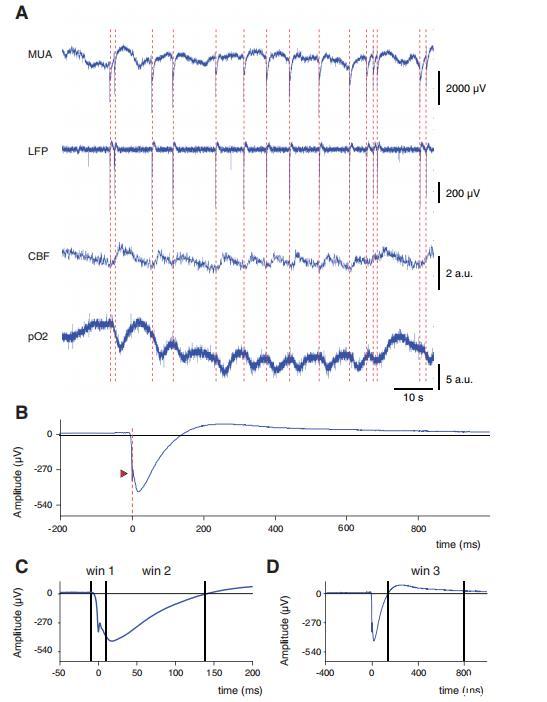圖3、對(duì)癲癇樣放電(EDs)的多模態(tài)響應(yīng)。A:同步多模態(tài)記錄數(shù)據(jù),包括硅探針采集的多單元電活動(dòng)(MUA)、場(chǎng)電極采集的局部場(chǎng)電位(LFP)、激光多普勒測(cè)量的腦血流量(CBF)以及氧探頭測(cè)量的組織氧分壓(PO2)。紅色虛線標(biāo)記每次放電的起始時(shí)間點(diǎn)(time 0)。a.u.表示任意單位。B:A圖中單個(gè)ED的放大顯示。紅色箭頭指示用于設(shè)定time 0的極尖銳峰值。C:分別對(duì)應(yīng)銳波上升支(win1)和下降支(win2)的時(shí)間窗放大圖。D:對(duì)應(yīng)EDs慢波成分(win3)的時(shí)間窗放大圖。