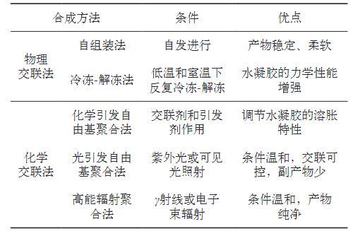 水凝膠的親水聚合物鏈通過化學或物理交聯法構成三維網絡結構,可充分吸水并維持3D層次結構。物理交聯法主要是通過非共價鍵作用形成聚合物,具有一定的可逆性,主要包括自組裝法、冷凍-解凍法等。化學交聯法是通過共價鍵作用交聯形成聚合物,具有不可逆性,主要包括化學引發自由基聚合法、光引發自由基聚合法和高能輻射法等。表1為水凝膠的主要合成方法。