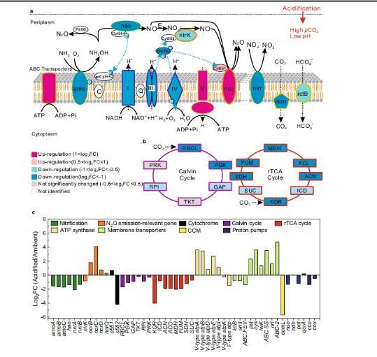 圖4、酸化對細菌硝化細菌的響應(yīng)。描述酸化對參與氨的逐步氧化(NH?→NH?OH→NO→NO??→NO??)、N?O產(chǎn)生、能量生成和細胞內(nèi)pH穩(wěn)態(tài)的基因表達影響的示意模型。由虛線表示膜的破裂,因為亞硝酸鹽氧化作用通常不會與氨氧化作用發(fā)生在同一有機體內(nèi),除了最近發(fā)現(xiàn)的共氨氧化Nitrospira外。相對基因表達的變化(FC)通過將酸化樣本與環(huán)境對照組進行比較計算。羅馬數(shù)字表示呼吸鏈中的酶復(fù)合物I(NADH脫氫酶)、復(fù)合物III(細胞色素bc1復(fù)合物)、復(fù)合物IV(細胞色素c氧化酶)和復(fù)合物V(ATP合成酶)。虛線藍色箭頭表示電子的移動。E,未知酶。b.酸化對通過Calvin循環(huán)和還原三羧酸(rTCA)循環(huán)固定CO?基因表達的影響。蛋白質(zhì)圖標中心的顏色表示基因轉(zhuǎn)錄本編碼這些蛋白的上調(diào)或下調(diào)程度。蛋白質(zhì)圖標外圍的顏色與(c)中的條形圖顏色相對應(yīng)。c.如(a)和(b)所示的蛋白質(zhì)編碼轉(zhuǎn)錄本的FC變化。