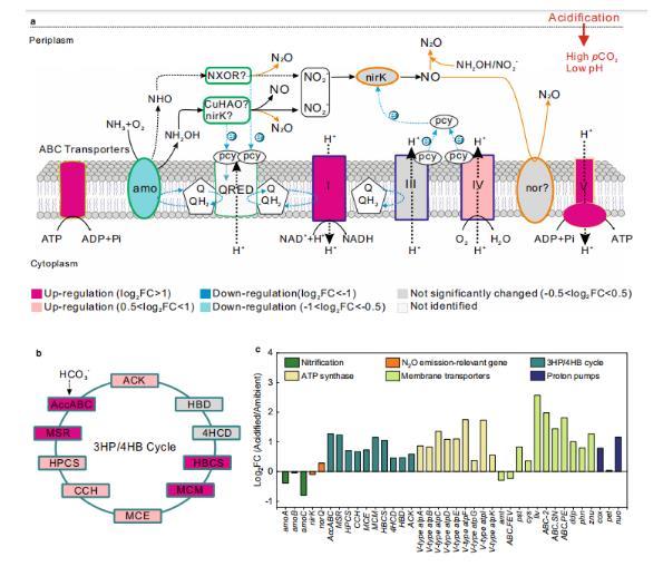 圖5、氨氧化古菌(AOA)對酸化的響應(yīng)。a.描述酸化對參與NH?氧化、N?O產(chǎn)生、能量生成和AOA的細胞內(nèi)pH穩(wěn)態(tài)基因表達的影響的示意模型。相對基因表達的變化(FC)通過將酸化樣本與環(huán)境對照組進行比較計算。羅馬數(shù)字表示呼吸鏈中的酶復(fù)合物I(NADH脫氫酶)、復(fù)合物III(b-pcy)、復(fù)合物IV(pcy-aa3)和復(fù)合物V(ATP合成酶)。虛線藍色箭頭表示電子的移動。b.酸化對參與3-羥基丙酸/4-羥基丁酸循環(huán)基因表達的影響。蛋白質(zhì)圖標中心的顏色表示基因轉(zhuǎn)錄本編碼這些蛋白的上調(diào)或下調(diào)程度。蛋白質(zhì)圖標外圍的顏色與(c)中的條形圖顏色相對應(yīng)。c.如(a)和(b)所示的蛋白質(zhì)編碼轉(zhuǎn)錄本的FC變化。