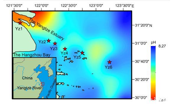 圖1、研究區(qū)域和采樣地點,疊加在近底水pH值圖上。各站點用紅色星號標記