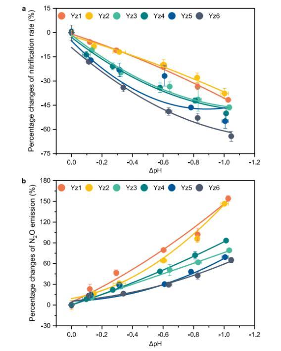 圖2、模擬水體酸化對長江口及其鄰近沿海區(qū)域硝化作用和相關(guān)N?O產(chǎn)生速率的響應(yīng)。硝化速率。數(shù)據(jù)展示了酸化處理組與環(huán)境對照組相比硝化速率的百分比變化。所有線條的P值均小于0.05。b.N?O產(chǎn)生速率。數(shù)據(jù)展示了酸化處理組與環(huán)境對照組相比N?O產(chǎn)生速率的百分比變化。所有線條的P值均小于0.05。誤差條表示標準差(n=3個生物學(xué)獨立樣本)。ΔpH對應(yīng)水體酸化前后pH值的變化。擬合曲線是通過多項式擬合方法獲得的。