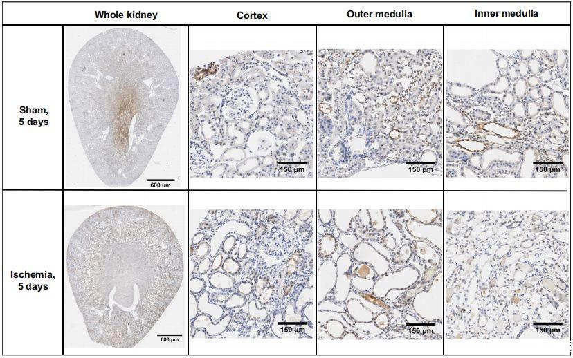 圖3、雙側(cè)腎缺血或假缺血恢復(fù)24小時后腎臟切片的咪唑加合物免疫組化。圖片為每組六個腎臟皮質(zhì)、外髓質(zhì)和內(nèi)髓質(zhì)區(qū)域的典型圖像。