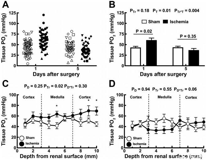 圖2、通過克拉克微電極評估組織PO2。首先將電極插入左腎皮層2毫米處的六個隨機位置。A:每只大鼠都進行了多次測量,不同的大鼠用不同的符號表示。封閉符號代表腎缺血大鼠(24小時內(nèi)9只,5天內(nèi)8只),而開放符號代表假缺血大鼠(24小時內(nèi)10只,5天內(nèi)7只)。B:每只大鼠皮層組織PO2的測量值取平均值,并以鼠間平均值SE表示。B中,PTr、PT和PTr*T是以治療(Tr)和時間(T)為因子的雙向方差分析(ANOVA)的結(jié)果。每對列上方的P值和誤差條顯示的是學(xué)生非配對t檢驗的結(jié)果,使用Dunn-Sidak校正k=2進行保守調(diào)整,以考慮在24小時和5天進行比較的事實。C和D:缺血或假缺血恢復(fù)后24小時(C)或5天(D),將電極從皮層表面以1毫米的增量推進到左腎10毫米處,建立組織PO2深度曲線。符號和誤差條是假缺血(○)或雙側(cè)腎缺血(實心○)1小時大鼠的平均值±SE。在C和D中,PD、PTr和PD*Tr是以深度(D)和治療為因子的雙向重復(fù)測量方差分析的結(jié)果。