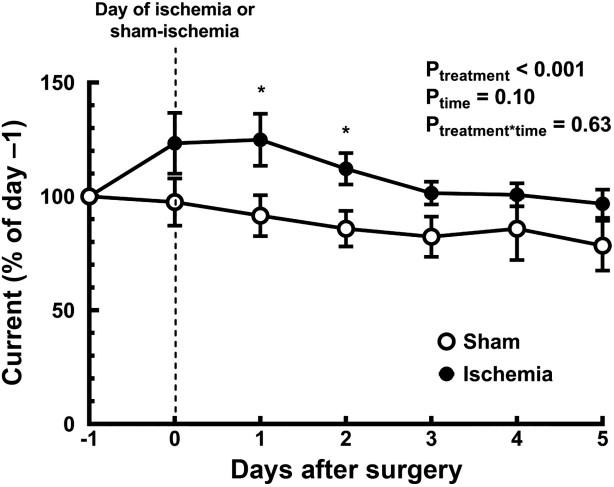 圖1、腎缺血或假缺血后內(nèi)髓組織PO2的時間變化。數(shù)值為大鼠接受一小時假缺血(5只)或雙側(cè)腎缺血(7只)后的平均值SE。手術(shù)前(第1天)和手術(shù)后(第0-5天)記錄組織PO2,以通過碳糊電極的電流進行評估。電流為每個24小時的平均值,并以手術(shù)前一天(第1天)平均值的百分比表示。Ptreatment、Ptime和Ptreatment*time是以治療和時間為因子的雙向重復(fù)測量方差分析的結(jié)果。