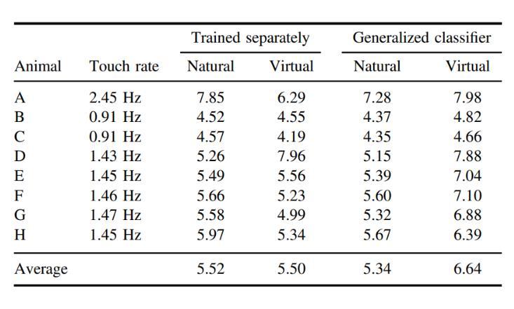 使用每只動物的平均觸摸頻率,表3顯示了真實觸摸標簽(位置、持續時間和幅度)與估計觸摸標簽之間的信息速率(位/秒)。在各動物中,虛擬觸摸攜帶的信息速率與自然觸摸大致相同。單獨訓練的自然和虛擬觸摸的平均信息速率為5.2位/秒,使用廣義分類器的虛擬觸摸的平均信息速率為6.64位/秒。