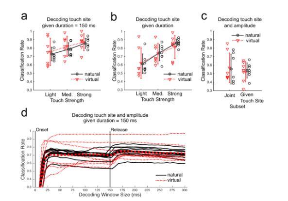 圖8(d)顯示了在固定持續時間的觸摸下解碼觸摸位置和幅度時,跨一系列窗口大小的分類率。可以看出,對于解碼觸摸部位和幅度,分類率在觸摸開始后15–20 ms達到峰值,并在整個觸摸窗口中保持較高水平,觸摸結束后不久略有增加。圖8.從自然(黑色)和虛擬(紅色)觸摸反應中正確推斷觸摸參數的性能。解碼使用廣義分類器——其線性判別分析(LDA)投影使用自然和虛擬觸摸的反應進行訓練。預測時,新示例首先投影,然后基于最近的自然觸摸均值進行分類。分類率計算為(正確分類試驗數)/(總試驗數),基于8次蒙特卡洛訓練/測試數據選擇(2/3訓練,1/3測試)。數據點代表動物。誤差條顯示動物間的±1標準差。(a)僅考慮短(150 ms)持續時間的輕、中或強刺激試驗時的解碼率。(b)已知觸摸強度時解碼持續時間和觸摸部位的分類率。(c)第一列顯示所有試驗的分類率,第二列顯示已知觸摸部位時解碼幅度和持續時間的準確性。(d)不同窗口大小的分類率。細線代表動物,粗線顯示動物平均值。