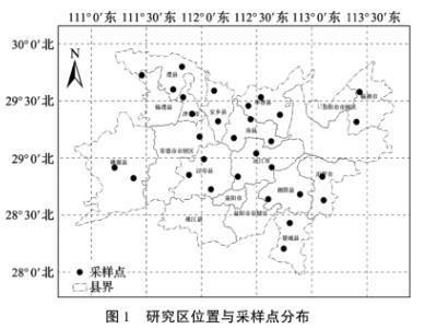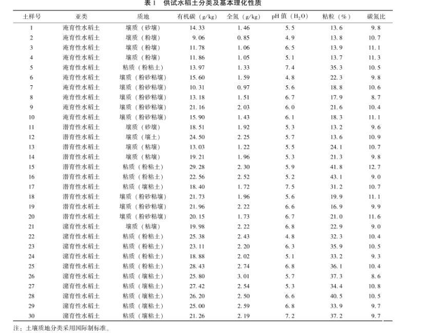 2012年晚稻收獲后在環洞庭湖區(111°13′~113°31′E,28°12′~29°32′N)采集30個表層(0~20 cm)水稻土樣本(圖1),所有采樣點均長期實行早稻-晚稻-冬閑的耕作制度及類似的田間管理措施。所采土壤代表了洞庭湖區由河湖沉積物、第四紀紅粘土、花崗巖、石灰巖、紫色砂巖等多種成土母質及沖積平原和丘陵坡崗兩種典型地形影響發育形成的水稻土,包括淹育性、潛育性、潴育性3個水稻土亞類及20余個水稻土土種。各水稻土亞類均采集10個土壤樣本,采集時,在每個采樣點0.1 hm2代表性范圍內隨機多點采集5 kg土樣組成混合樣品。采集的混合土樣去除肉眼可見石粒和植物殘渣,經風干、過2 mm篩且充分混勻后常溫下貯存待測。土壤采樣點及基本理化性質見表1。