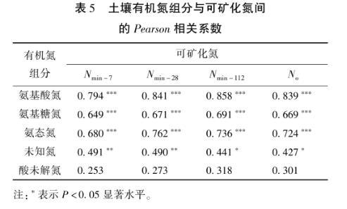 表5土壤有機氮組分與可礦化氮間的Pearson相關系數