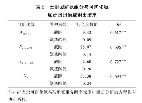 有機氮各組分間相互關聯,使得各酸解氮組分與可礦化氮間的顯著相關關系并不能說明前者對后者的真實貢獻及貢獻大小。為此,進一步進行可礦化氮與酸解氮組分間的多元逐步回歸分析,結果顯示(表6),酸解氮中,始終只有氨基酸氮進入逐步回歸方程,其偏回歸系數始終均為正值且逐漸增大,方程決定系數(R2)亦均達0.001顯著性水平,表明氨基酸氮對土壤可礦化氮具有穩定且重要的貢獻,是后者的主要來源。