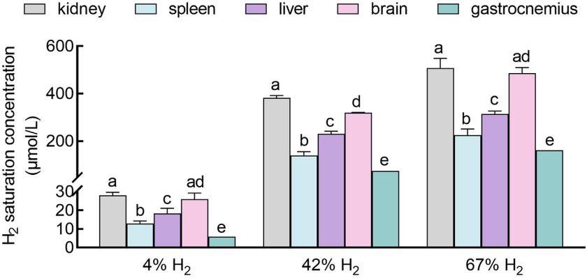 圖3、小鼠吸入不同濃度氫氣(4%、42%和67%)后腎臟、脾臟、肝臟、腦和腓腸肌中的氫氣飽和濃度。數(shù)據(jù)顯示為均值±SD(n=3–5只小鼠/組織)。采用單因素方差分析和LSD檢驗進行統(tǒng)計分析。不同字母表示組織間P<0.05的顯著差異。