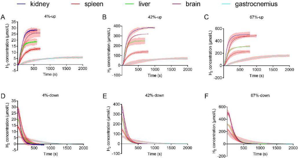 圖2、腎臟、脾臟、肝臟、腦和腓腸肌中氫氣濃度的實時曲線。(A–C)吸入不同濃度氫氣(4%、42%和67%)期間氫氣濃度的變化。(D–F)停止吸入不同濃度氫氣(4%、42%和67%)后氫氣濃度的變化。數(shù)據(jù)顯示為均值±SD(n=3–5只小鼠/組織)。每條線周圍的陰影區(qū)域表示95%置信區(qū)間。