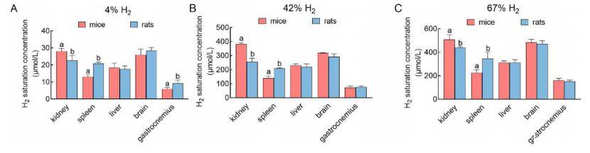 圖4、H2在小鼠和大鼠腎臟、脾臟、肝臟、大腦和腓腸肌中的飽和濃度比較吸入不同濃度的H2(4%、42%和67%)后,小鼠和大鼠腎臟、脾臟、肝臟、大腦和腓腸肌中H2飽和濃度的比較。數(shù)據(jù)以平均值SD表示(n=3-5只小鼠/組織)。統(tǒng)計分析采用獨立樣本t檢驗。不同字母表示小鼠和大鼠同一組織中H2飽和濃度的顯著差異。