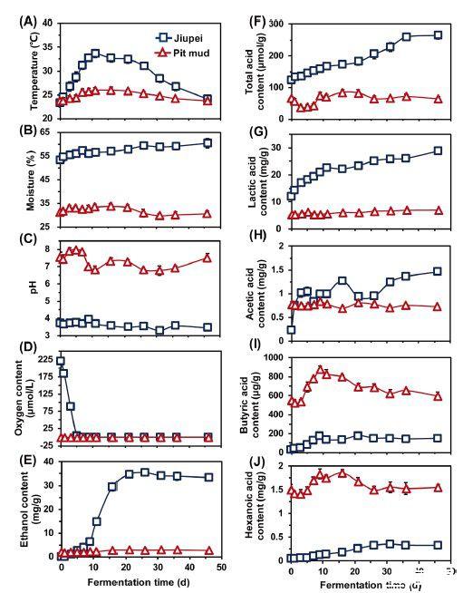 泥窖長期以來一直被用作中式濃香白酒發(fā)酵的厭氧生物反應(yīng)器,其中淀粉原料(主要是高粱)被多物種微生物代謝成乙醇和各種風(fēng)味化合物。發(fā)酵谷物和坑泥是泥窖中兩個空間相關(guān)的微生物棲息地,但它們的代謝分工仍不清楚。在這里研究人員研究了發(fā)酵過程中發(fā)酵谷物和窖泥中環(huán)境變量(如溫度、氧氣、pH值)、關(guān)鍵代謝物(如乙醇、有機(jī)酸)和微生物群落的變化。酒胚(發(fā)酵谷物)(低pH值、高乙醇)和窖泥(中性pH值)為微生物生長提供了兩個環(huán)境條件截然不同的棲息地。乳酸在發(fā)酵谷物中積累,而丁酸和己酸主要由棲息在窖泥中的微生物產(chǎn)生。