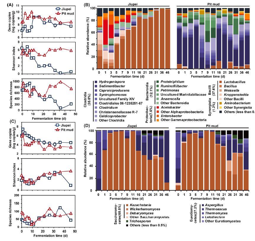 利用實時定量PCR的生物量分析表明,細(xì)菌在發(fā)酵過程中占微生物群落的主導(dǎo)地位,此外聚類和主坐標(biāo)分析(PCoA)分析顯示酒胚和窖泥的細(xì)菌群落存在顯著差異。Unisense微電極系統(tǒng)被用于監(jiān)測發(fā)酵過程中酒胚和窖泥的氧氣含量變化,研究人員能夠在白酒發(fā)酵過程中實時監(jiān)測氧氣濃度的變化,從而更好地理解發(fā)酵過程中微生物的代謝活動和氧氣利用情況。酒胚中細(xì)菌群落多樣性在發(fā)酵過程中顯著降低,在窖泥中相對穩(wěn)定。乳酸菌屬在發(fā)酵谷物中菌群落中占主導(dǎo)地位,其相對豐度在發(fā)酵結(jié)束時達(dá)到98.0%。梭狀芽胞桿菌(相對豐度:42.9-85.5%)是窖泥中最豐富的細(xì)菌,主要分布在氫孢菌屬(5.3-68.4%)。發(fā)酵谷物和窖泥的真菌群落表現(xiàn)出相似的演替模式,其中Kazachstania、Aspergillus和Thermoascus是優(yōu)勢屬。PICRUSt分析表明,參與乙酸和乳酸生物合成的酶主要富集在九平樣品中,而窖泥中的細(xì)菌群落表現(xiàn)出更大的丁酸和己酸合成潛力。體外模擬發(fā)酵的分析進(jìn)一步驗證了九平微生物群在乙酸和乳酸生產(chǎn)中的作用,這些酸隨后被坑泥微生物群代謝為丁酸和己酸。本研究工作證明了酒胚(發(fā)酵谷物)和坑泥微生物群落之間的協(xié)同合作,以形成濃郁風(fēng)味的白酒的代表性風(fēng)味。