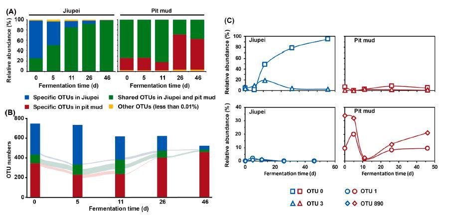 圖4、白酒發(fā)酵窖中不同微生物棲息地之間的細(xì)菌流動。(A)直方圖顯示了發(fā)酵谷物和窖泥樣品在發(fā)酵不同階段的共享OTU的相對豐度。(B)跟蹤酒平樣品在不同發(fā)酵階段共享OTU的Sankey圖(矩形的高度與OTU的數(shù)量相關(guān))。(C)發(fā)酵谷物和窖泥中主要OTU的相對豐度動態(tài)。
