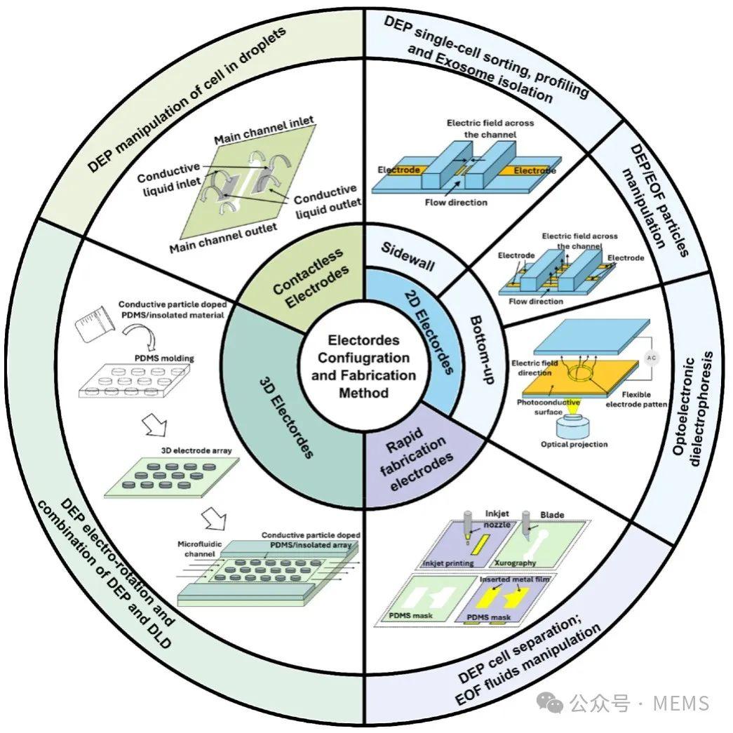 本綜述系統地介紹了最新的微電極制造技術、材料選擇及設計策略,旨在為生物應用中的微尺度系統中介電泳與電滲流性能的優化提供參考。圖2展示了微流控器件中的電極配置和制造方法概述。