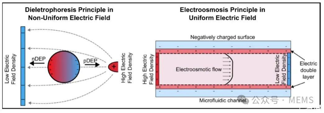 據麥姆斯咨詢報道,近日,美國斯坦福大學、伊利諾伊大學芝加哥分校和孟菲斯大學的研究人員組成的團隊在Micromachines期刊上發表了題為“Design and Fabrication of Microelectrodes for Dielectrophoresis and Electroosmosis in Microsystems for Bio-Applications”的綜述論文,重點介紹了用于介電泳(DEP)和電滲流(EOF)的微電極的設計與制造,這些都是在微流控器件中實現微粒與微流體操控的關鍵技術。介電泳依賴非均勻電場,根據微粒的介電特性進行操控;而電滲流則利用均勻電場在微通道中產生穩定的流體流動。