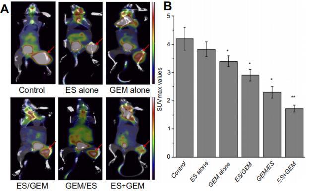 各組18F-FDG成像的SUVmax值為(圖4):對照組為4.2±0.4,單用ES組為3.83±0.26,單用GEM組為3.4±0.2,ES/GEM組為2.9±0.21,GEM/ES組為2.3±0.21,ES+GEM組為1.73±0.12。與對照組相比,單用GEM組的SUVmax值明顯下降(P<0.05)。在所有治療組中,ES+GEM組的腫瘤細胞SUVmax值最低(P<0.05)。令人驚訝的是,單純ES組與對照組的SUVmax值無明顯差異(P>0.05)。