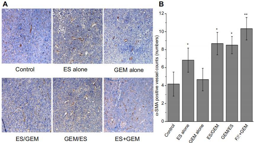 此外,α-SMA染色顯示了不同處理后血管生成的程度(圖7)。與對照組(4.17血管/平方毫米)相比,單純ES組(6.83血管/平方毫米,P<0.05)、ES/GEM組(8.67血管/平方毫米,P<0.05)和GEM/ES組(8.5血管/平方毫米,P<0.05)的α-SMA陽性血管數量顯著增加。然而,單用GEM組(4.67血管/mm2)與對照組無明顯差異(P>0.05)。此外,ES+GEM組的α-SMA陽性血管數量(10.33血管/mm2)是各組中最高的(P<0.05)。