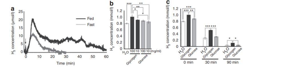 圖1、氫在飽食肝臟和體外糖原溶液中積累和維持。(a)使用針型氫微電極監測飽食或過夜禁食大鼠肝臟中分子氫的濃度。大鼠通過胃管飼法口服氫水(水中含0.8mmol/lH?),劑量為15ml/kg。箭頭表示大鼠給予氫水的時間點。(b)糖原和葡萄糖溶液以及水中氫的飽和濃度。通過鼓泡H2氣體至飽和水平,將分子氫溶解在指定溶液中。使用氫微電極測量溶液中的氫濃度。數據為平均值±標準差(n=3)。與100或10mg/ml糖原組相比,P<0.05;P<0.01;P<0.001。(c)停止鼓泡后水、100mg/ml糖原溶液和100mg/ml葡萄糖溶液中的氫濃度。氫飽和溶液在常壓下于20℃在去蓋的塑料管中保存0、30或90分鐘。使用氫微電極測量溶液中的氫濃度。