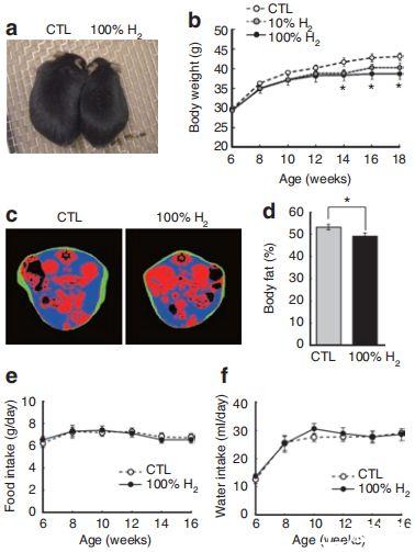 圖3、消耗分子氫抑制肥胖。(a)給予含或不含氫的水3個月的db/db小鼠外觀。拍攝了每組的平均小鼠照片。(b)給予含100%(0.8mmol/l)或10%(0.08mmol/l)氫的水的db/db小鼠的體重每兩周檢測一次。對照組(CTL)接受不含氫的水。*P<0.05;100%H2組vs.對照組(H2組n=9,對照組n=6)。(c)平均db/db小鼠飲用含或不含氫的水3個月后腹部的代表性CT圖像。藍色、綠色和紅色分別代表內臟脂肪、皮下脂肪和肌肉。(d)通過整合CT掃描圖像中每個切片的脂肪面積計算出的db/db小鼠總體脂成分。數據為平均值±標準誤(n=15)。*P<0.05。(e)食物和(f)水的攝入量在整個實驗期間每兩周測量一次。