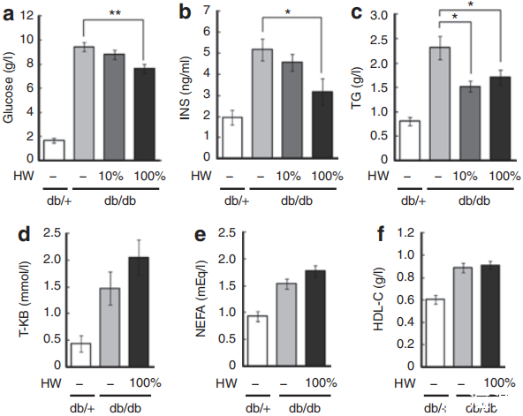 圖4、消耗分子氫抑制高血糖、高胰島素血癥和血漿甘油三酯水平。Db/db小鼠給予含100%(0.8mmol/l)或10%(0.08mmol/l)氫的水3個月。Db/+和db/db小鼠在相同時間內給予不含氫的水(HW)作為對照。進行生化分析以獲得db/+和db/db小鼠的血漿參數。(a)血漿葡萄糖濃度,(b)胰島素,(c)甘油三酯(TG),(d)總酮體(T-KB),(e)游離脂肪酸(NEFA),(f)高密度脂蛋白膽固醇(HDL-C),(g)低密度脂蛋白膽固醇(LDL-C),(h)總膽固醇(T-CHO),以及(i)脂聯素(ADN)顯示為平均值±標準誤(n=15)。