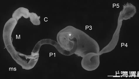 圖1:Nasutitermes corniger的腸道。腸道包括嗉囊(C)、中腸(M)、混合段(ms)和幾個后腸節段(P1至P5);星號(*)標記P2(幽門瓣)的位置。
