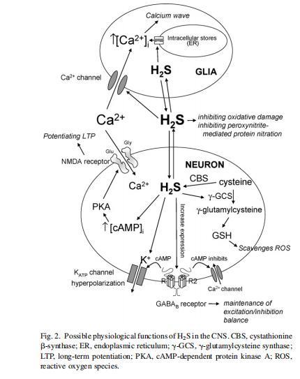 最近還顯示,H?S上調(diào)γ-氨基丁酸(GABA)B受體(GABABR),這是一種位于突觸前和突觸后位點的G蛋白偶聯(lián)受體(Han et al.,2005)。刺激突觸后受體產(chǎn)生長時程抑制性突觸后電位,導(dǎo)致K?電導(dǎo)增加,對抑制性神經(jīng)傳遞的微調(diào)很重要。H?S已顯示通過增加K?外流(可能通過ATP依賴性K?(KATP)通道)使CA1區(qū)和中縫背核神經(jīng)元超極化(Reiffenstein et al.,1992)。在突觸前位點,GABABR通過抑制電壓敏感性Ca2?通道調(diào)節(jié)神經(jīng)遞質(zhì)(如GABA和Glu)釋放。H?S上調(diào)GABABR表達暗示H?S可能在維持腦內(nèi)興奮/抑制平衡中起作用。