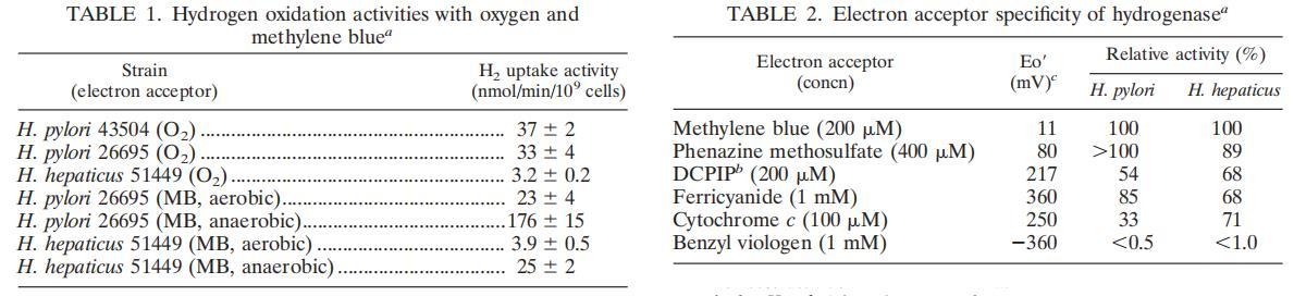 據報道,吸收型氫化酶會出現厭氧活化(有時稱為還原活化)現象。其特點是在高度還原或無氧條件下,酶的活性要高得多。當反應混合物中存在氧氣時,肝菌酶的厭氧氫氧化率僅為16%(表1)。這一厭氧活化量與我們觀察到的幽門螺桿菌細胞(表1)以及我們之前從臨床幽門螺桿菌分離物中觀察到的膜相似。對于已經詳細研究過這種厭氧活化的系統來說,在還原條件下實現全部活性與電子受體還原速率(即氫酶周轉率)有關。
