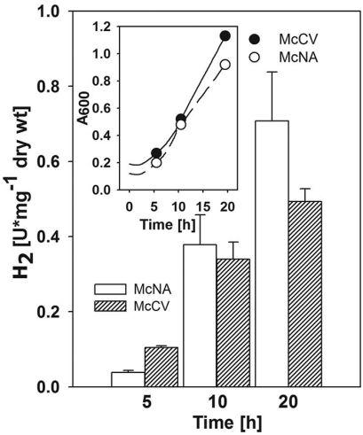 圖3、H2限制條件下生長的靜息細胞甲酸鹽依賴H2生產的變化。野生型S2在1升Wheaton瓶中用100 ml肉湯培養,分別使用基本培養基McNA(○)和豐富培養基McCV(●)。實驗開始時,瓶子用138 kPa H2-CO2(80:20[體積比])加壓。在不同吸光度時采集細胞樣品(20 ml),如插圖中生長曲線上的點所示。每次取樣后,瓶子用N2-CO2(80:20[體積比])重新加壓。這導致H2限制但維持CO2濃度。