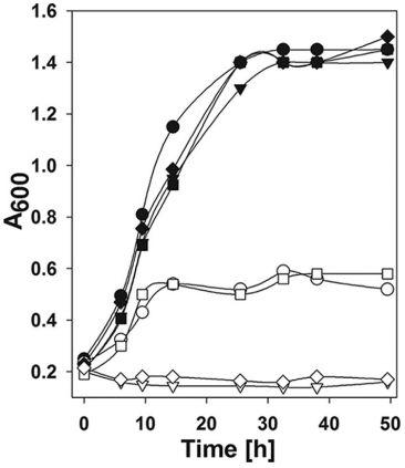 圖4、野生型和fdh突變株在H2或甲酸鹽條件下的生長情況。實心符號表示H2(276 kPa;H2-CO2 80:20[體積比])條件下的生長;空心符號表示甲酸鹽(100 mM)條件下的生長。圓形代表S2;倒三角形代表ΔfdhA1;方形代表ΔfdhA2;菱形代表ΔfdhA1-ΔfdhA2。每個數據點代表兩次重復實驗的平均值。