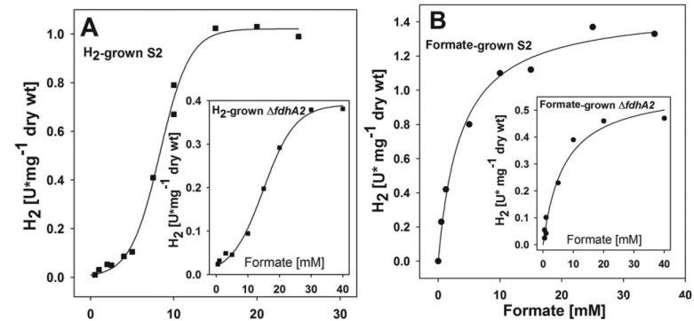 圖5、野生型菌株S2靜息細胞的甲酸鹽依賴性H2生產動力學,該菌株先前分別在H2(A)或甲酸鹽(B)條件下培養。ΔfdhA2突變體的動力學如插圖所示。S2和ΔfdhA2突變株分別培養至吸光度約0.8和0.6。